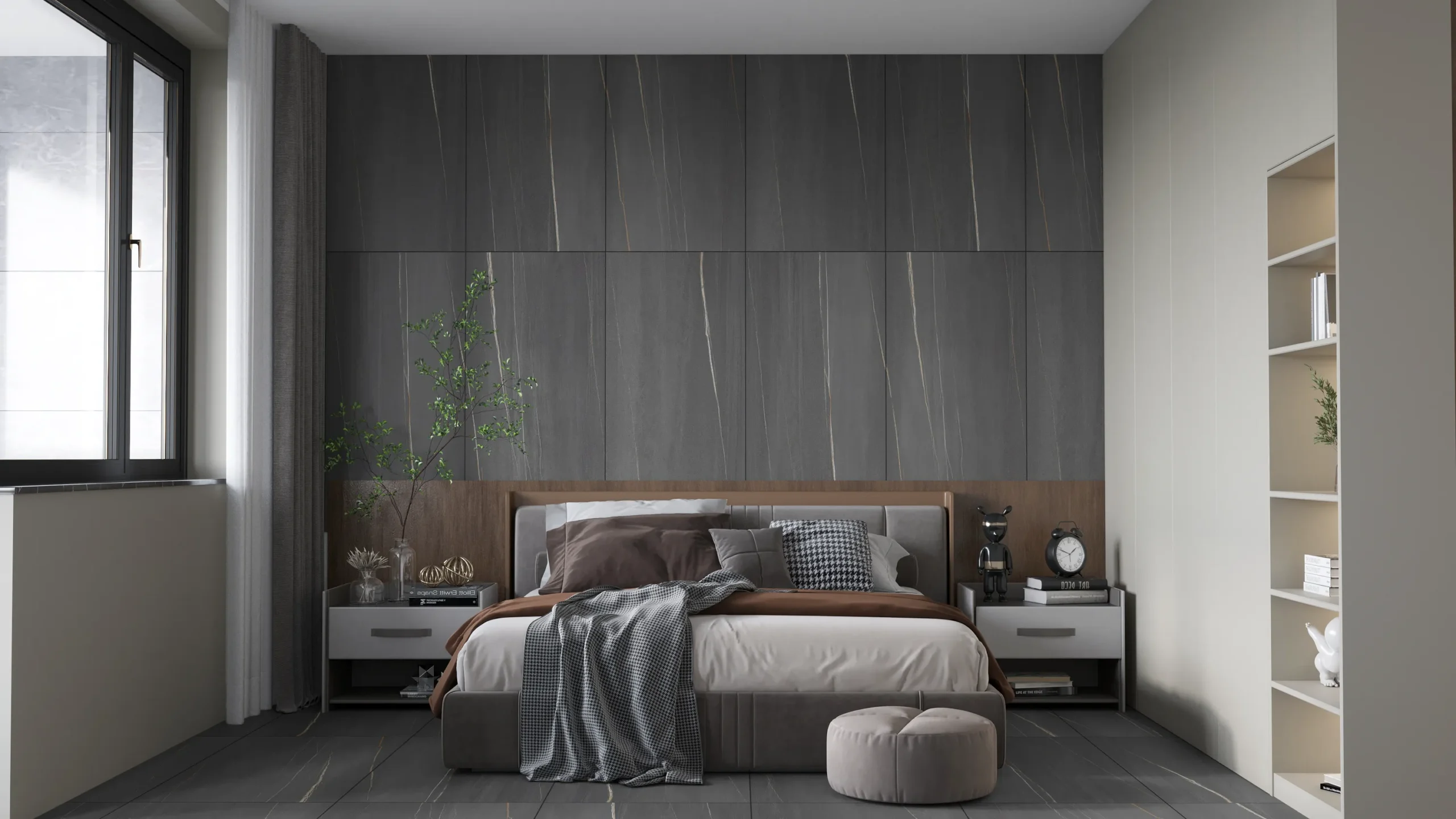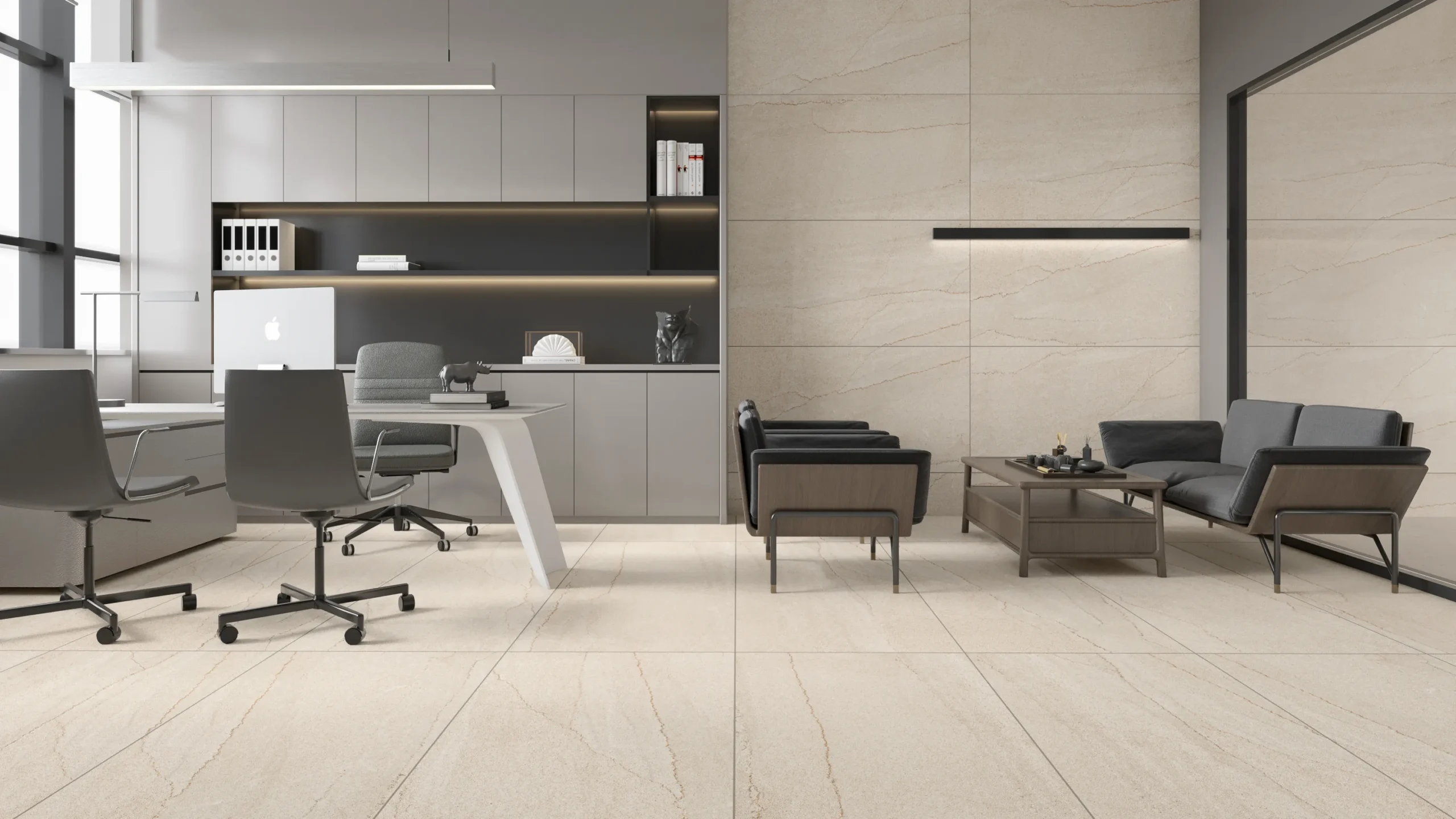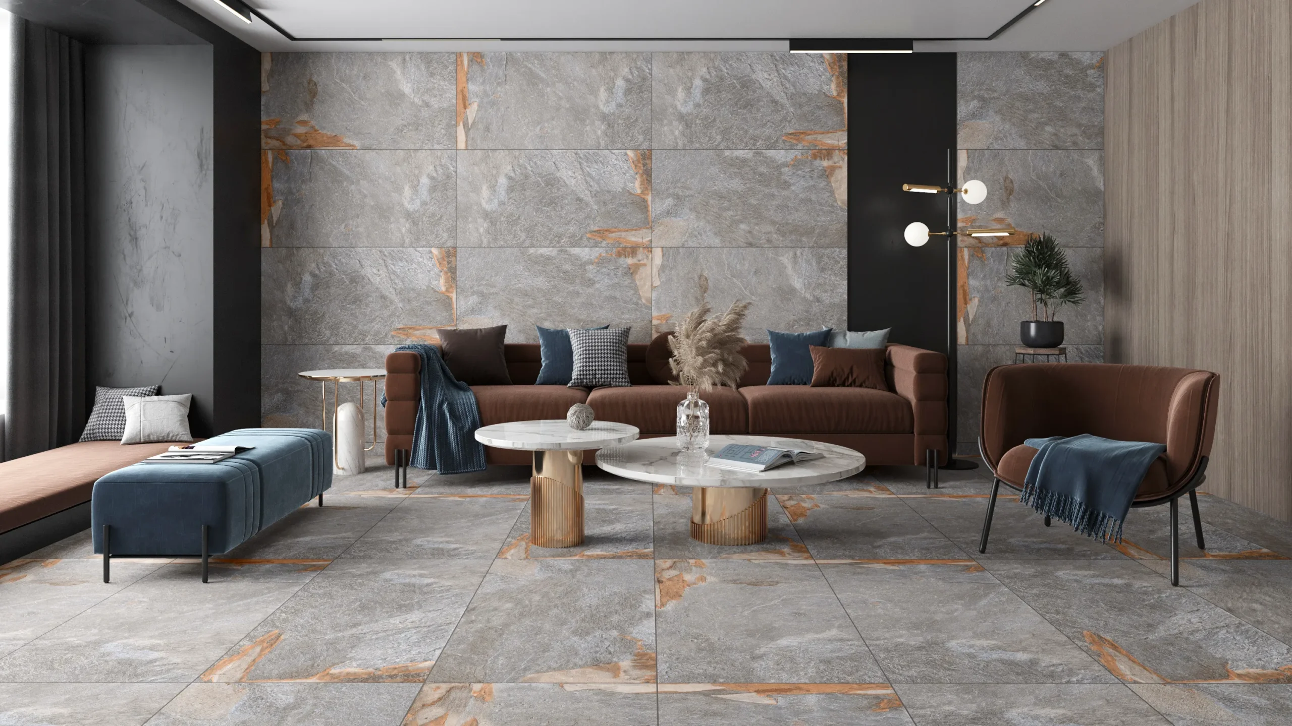 Combining matte floors with polished walls enhances the contrast and elegance.