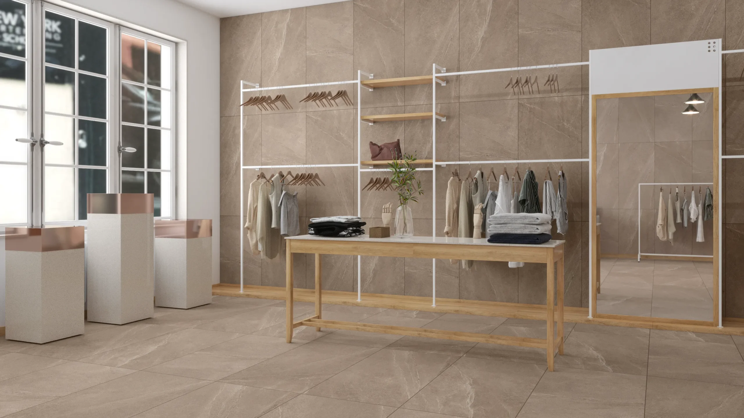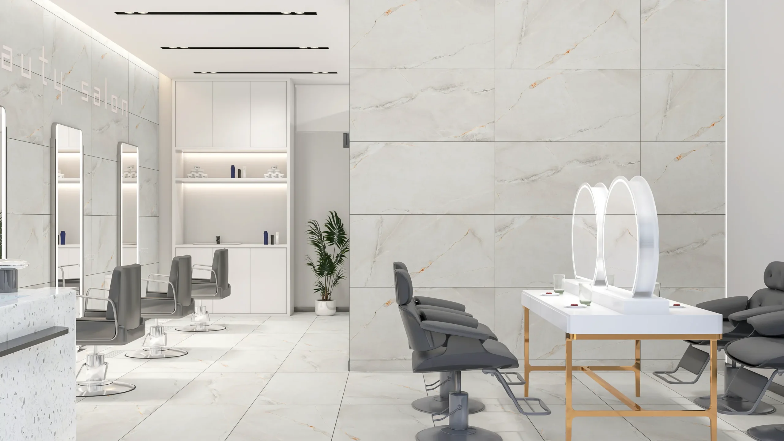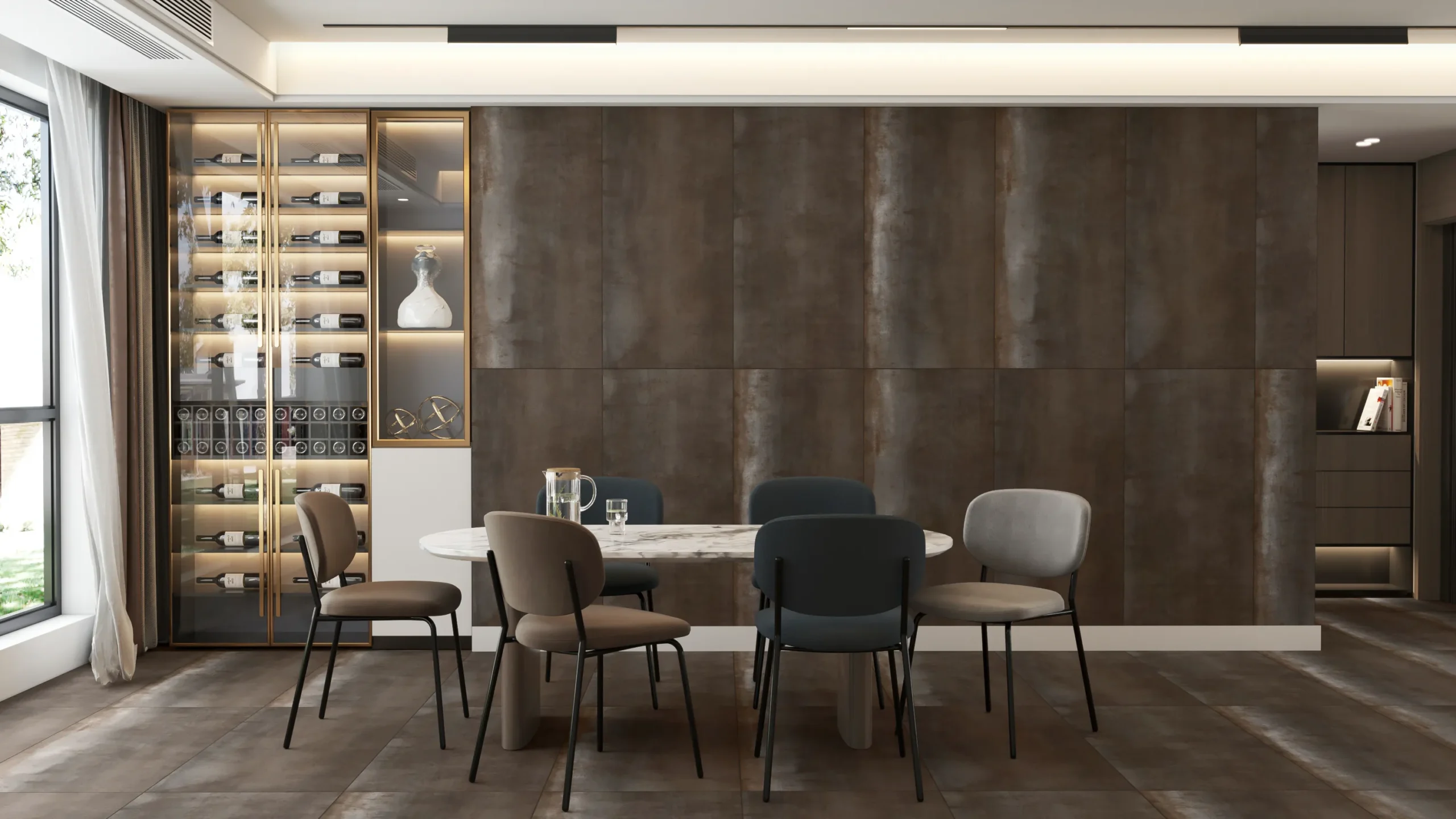 Combining matte floors with polished walls enhances the contrast and elegance.