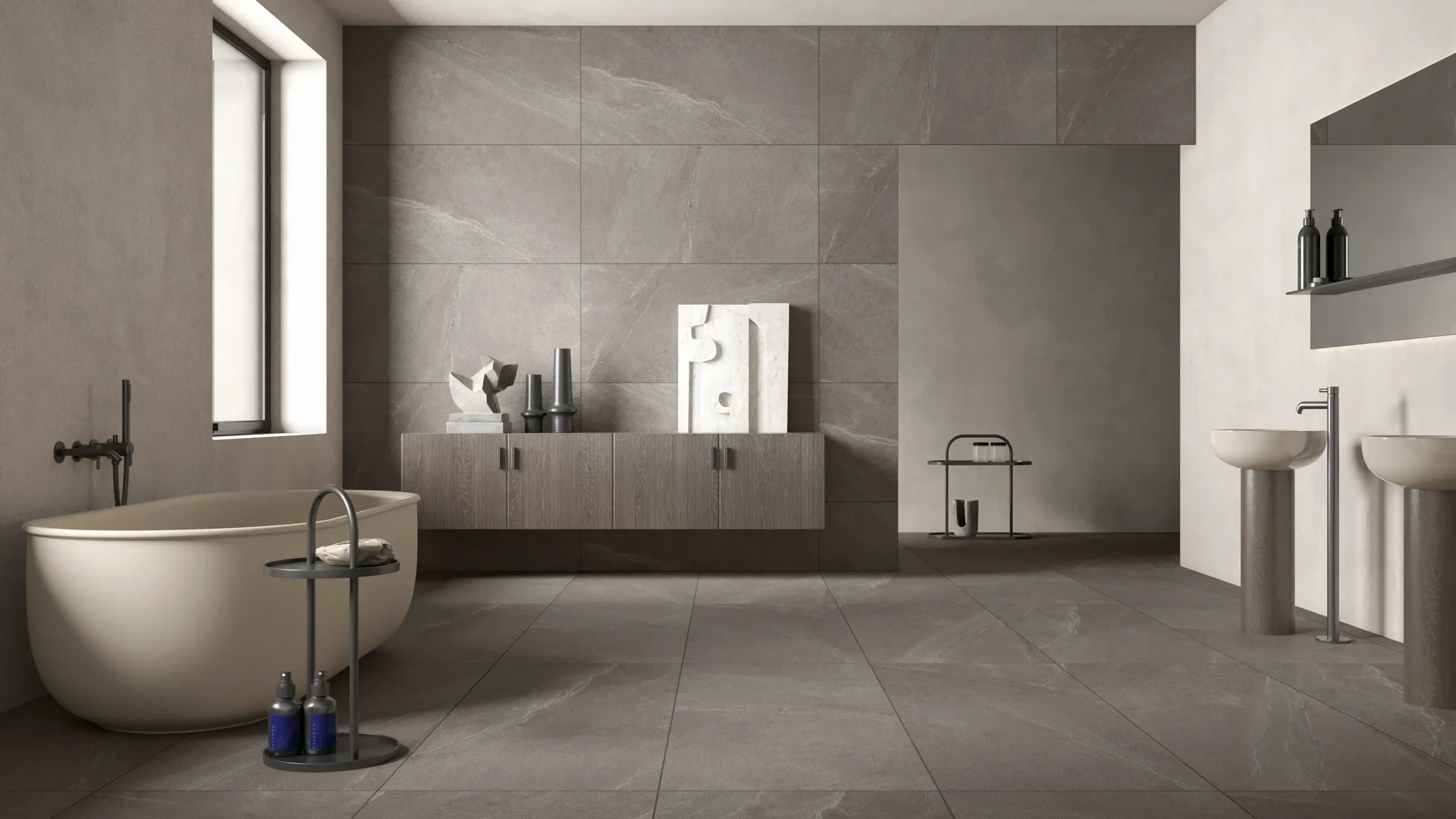 Using floor-to-ceiling large format tiles creates a sleek, minimalistic look.