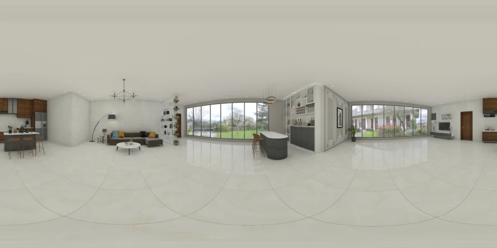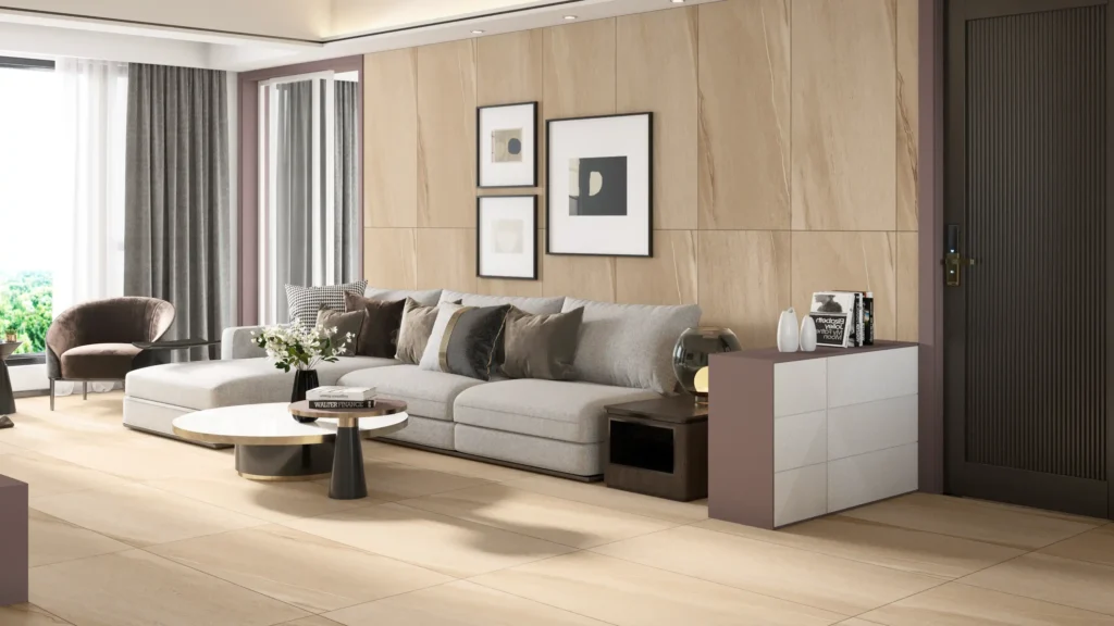 In the living room, tiles should make the space feel welcoming and comfortable because this is where families spend most of their time. Soft stone inspired tiles or warm neutrals work beautifully here. They reflect light gently, don’t look harsh in sunlight, and match easily with changing furniture and wall colors. The goal is simple: the floor should support the room, not dominate it.