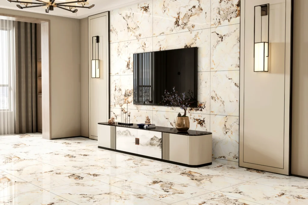 These tiles are inspired by limestone, slate, and soft marble like surfaces. They don’t try to look dramatic, they simply bring a gentle natural feel into the home. People love them because they reduce visual stress; your eyes don’t get tired looking at them every day. They are also very easy to pair with wood furniture, fabric sofas, plants, and neutral wall colors. The biggest advantage is simple: they don’t get boring.