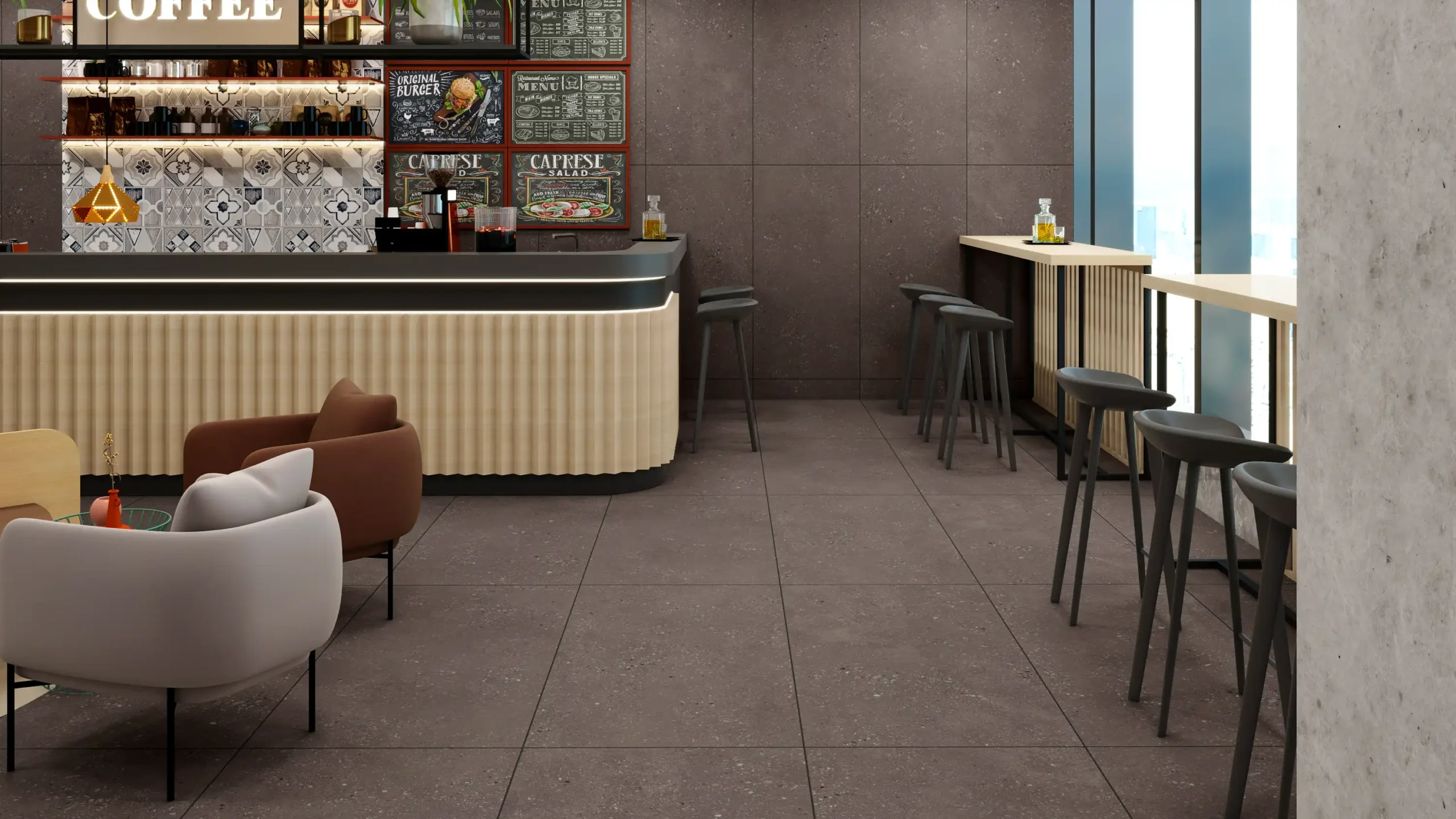 Concrete cement look tiles bring a modern, industrial aesthetic to any space, combining the raw appeal of cement with the durability and ease of porcelain or ceramic tiles. These tiles offer a minimalist and urban vibe, ideal for contemporary interiors and exteriors.