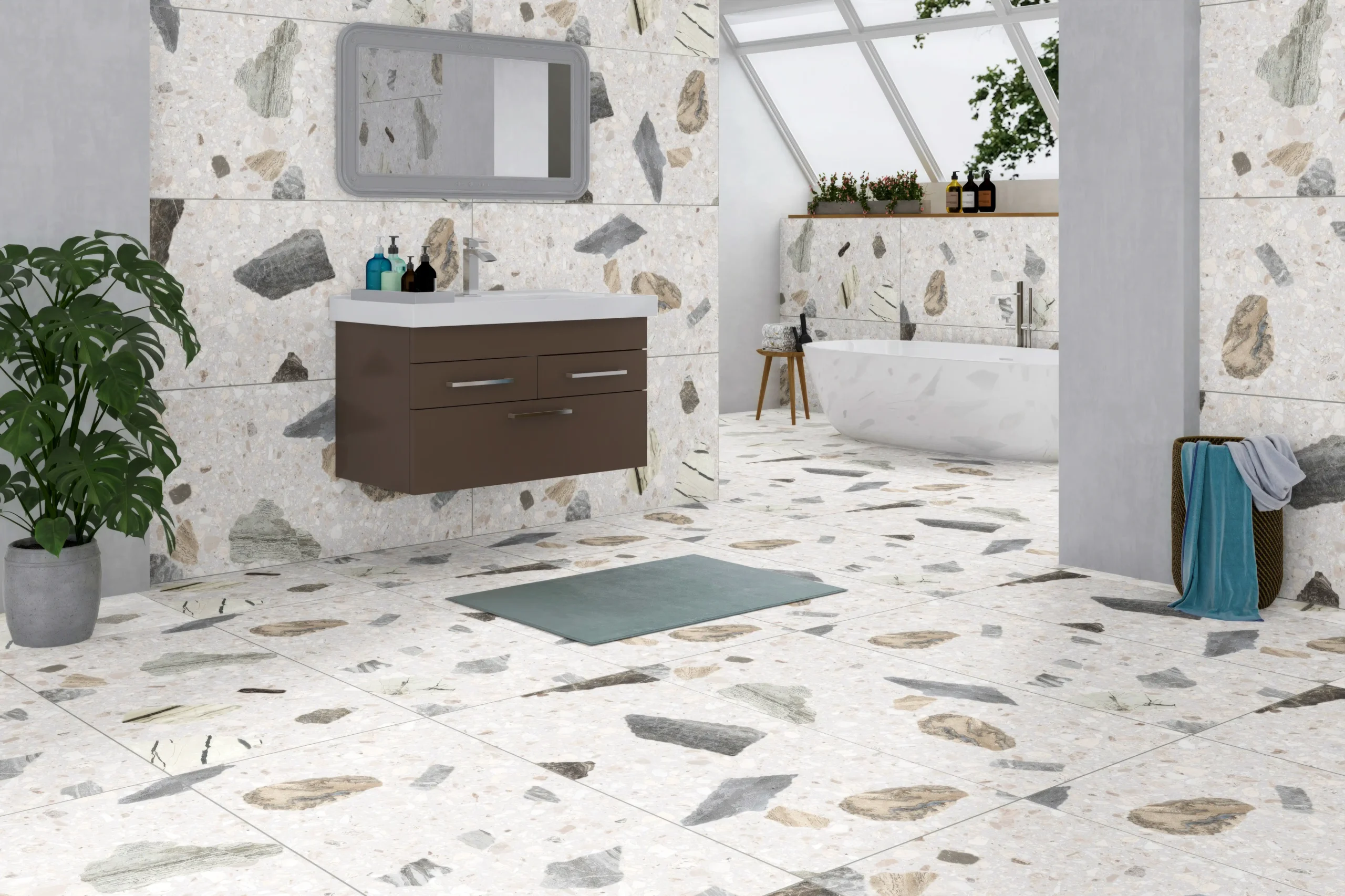 Terrazzo look tiles capture the vibrant, speckled design of traditional terrazzo flooring, offering a unique blend of modern flair and timeless appeal. These tiles mimic the look of colorful stone chips embedded in cement, creating a dynamic, artistic surface that adds personality and texture to any space.